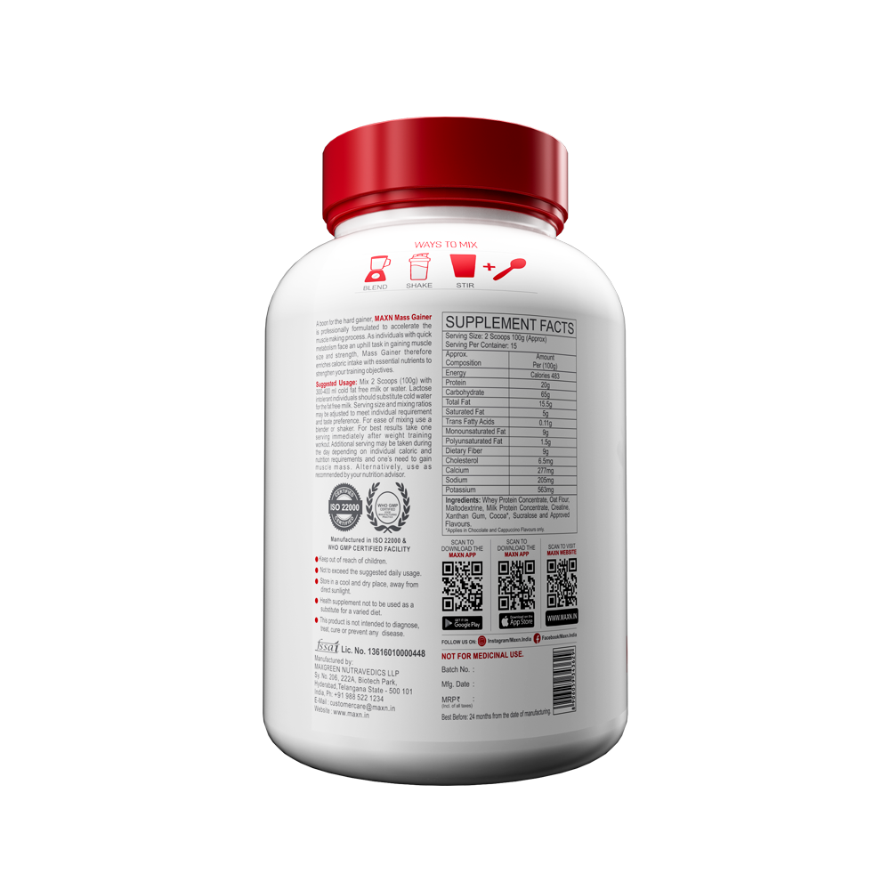 MAXN’s mass gainer supplement is one of the best mass gainers available on the market, formulated with a potent combination of whey protein concentrate, oat flour, milk protein concentrate, creatine, etc. The formulation is a blend of proteins, carbohydrates, fats, dietary fiber, vitamins, and minerals that help in promoting muscle mass growth and muscle recovery, gaining weight, and preventing muscle breakdown.
