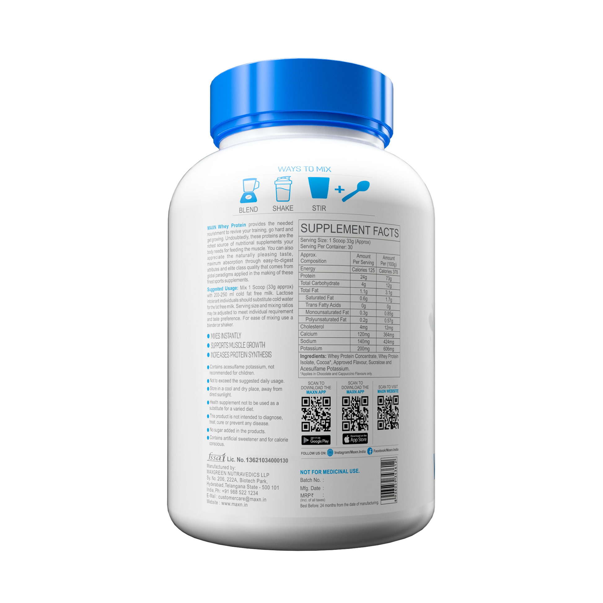 Maxn Whey Protein Supplement brings you 100% whey protein concentrate, to help you build muscle by providing your body with all the essential macro-nutrients and amino acids that your body needs to amalgamate large amounts of muscle protein than it breaks down. This is why anyone looking to build muscle needs to make sure they’re getting the right amount of protein. It’s not just us saying that, there’s a body of research that confirms the part, protein plays in building muscle. Maxn Whey Protein provides you the needed nourishment to train hard and get growing. Undoubtedly, these proteins are the richest source of nutritional supplements your body needs for feeding the muscle. You will also appreciate the naturally pleasing taste, maximum absorption through easy-to-digest attributes, and the elite class quality that comes from global paradigms applied in the making of these finest sports supplements